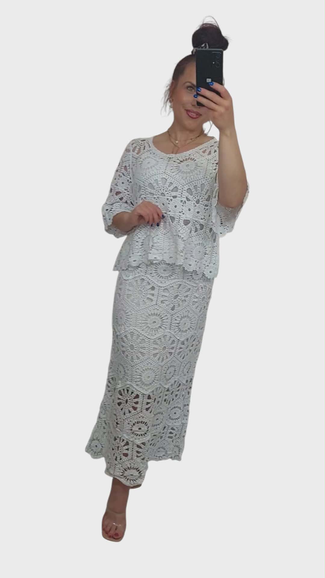 Komplet ażurowy składający się z bluzki oraz spódnicy z gumką w pasie to idealna propozycja na ciepłe dni, łącząca elegancję i komfort. Ażurowy wzór bluzki nadaje całości lekkiego i subtelnego charakteru, a miękki materiał zapewnia przewiewność i wygodę. Spódnica z gumką w pasie dopasowują się do sylwetki, gwarantując wygodę i swobodę ruchów. Taki komplet świetnie sprawdzi się na wakacyjne wyjazdy, letnie spotkania czy codzienne stylizacje w ciepłych miesiącach. Idealny do połączenia z sandałami, espadrylami czy delikatnymi akcesoriami, tworząc modny, a zarazem komfortowy look.