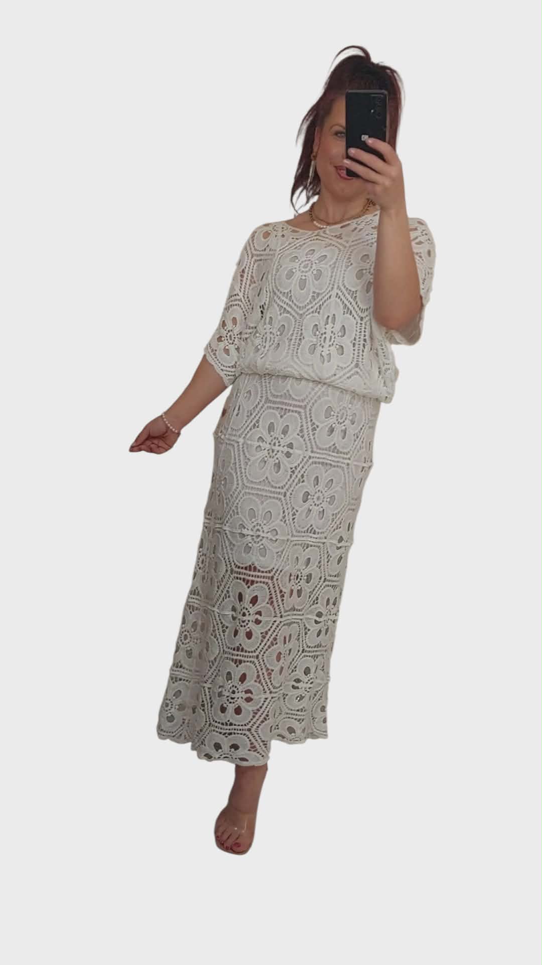 Komplet ażurowy składający się z bluzki oraz spódnicy z gumką w pasie to idealna propozycja na ciepłe dni, łącząca elegancję i komfort. Ażurowy wzór bluzki nadaje całości lekkiego i subtelnego charakteru, a miękki materiał zapewnia przewiewność i wygodę. Spódnica z gumką w pasie dopasowują się do sylwetki, gwarantując wygodę i swobodę ruchów. Taki komplet świetnie sprawdzi się na wakacyjne wyjazdy, letnie spotkania czy codzienne stylizacje w ciepłych miesiącach. Idealny do połączenia z sandałami, espadrylami czy delikatnymi akcesoriami, tworząc modny, a zarazem komfortowy look.