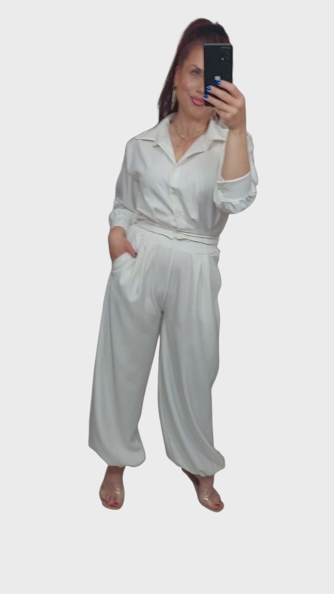 Komplet damski składający się z niezwykle wygodnych i modnych szerokich spodni z paskiem oraz krótkiej koszuli z gumką na dole. Połączenie wygody oraz elegancji.