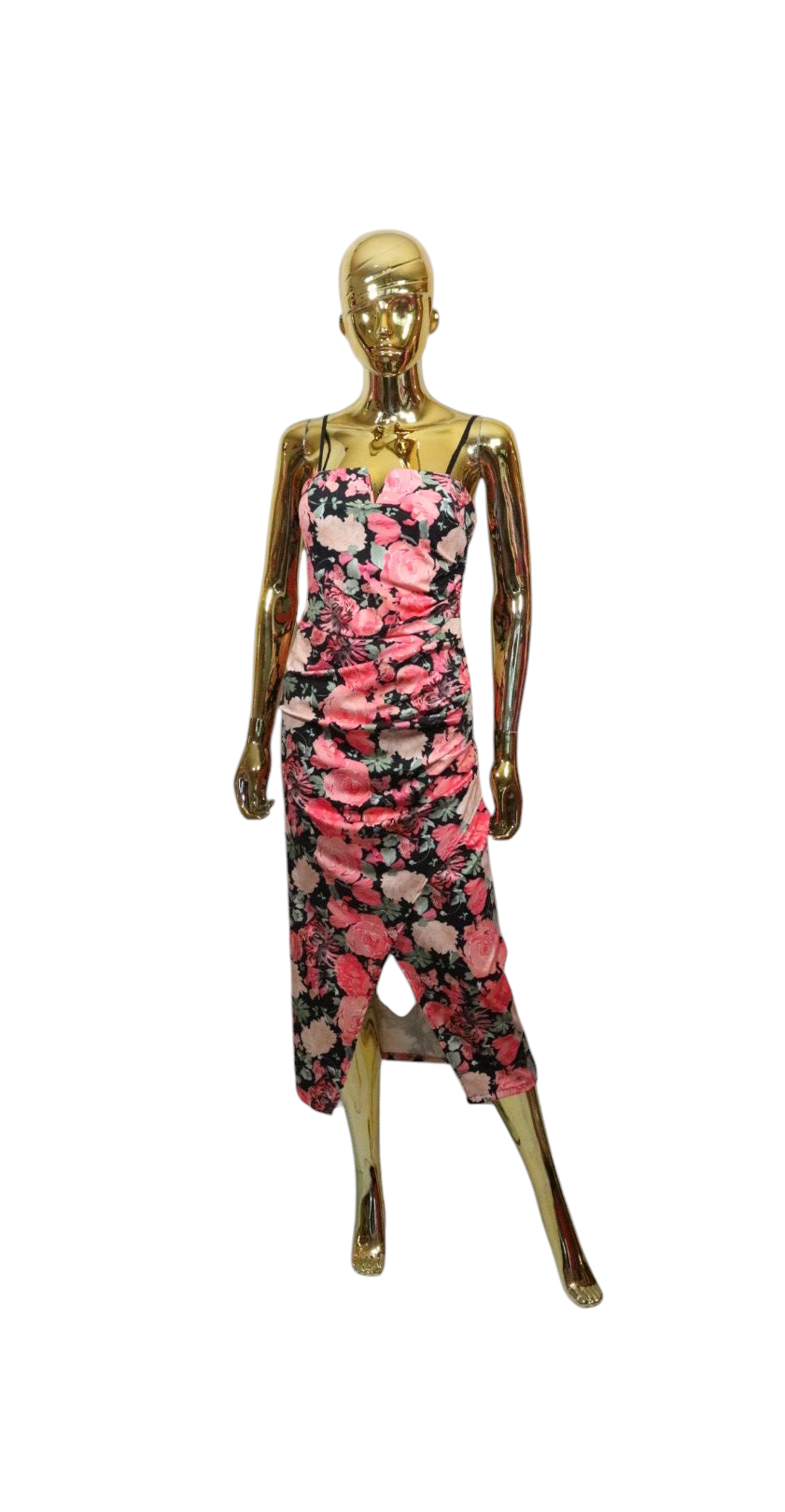 Sukienka midi w kwiaty z efektownym rozporkiem . Niecodzienny krój zapewnia komfort noszenia oraz oryginalny look. Idealna na ciepłe dni, świetnie prezentuje się w wersji sportowej jak i eleganckiej.