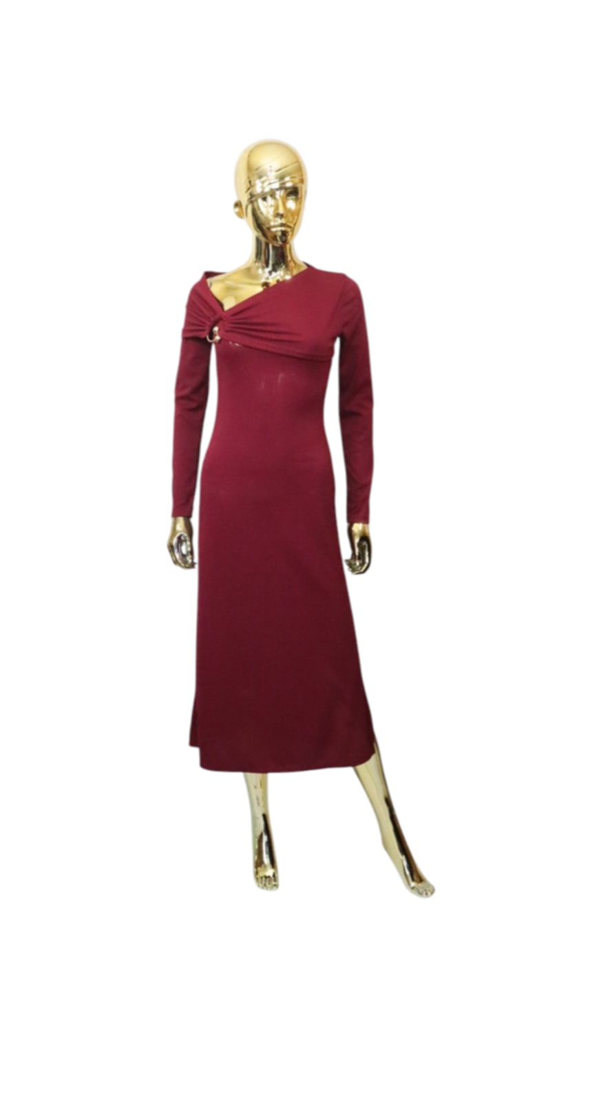 Sukienka midi wykonana z prążkowanego materiału z efektownym rozporkiem. Niecodzienny krój zapewnia komfort noszenia oraz oryginalny look.