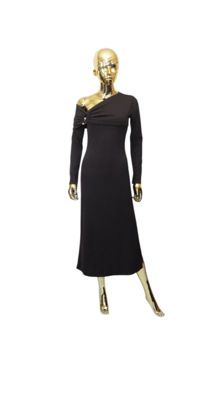 Sukienka midi wykonana z prążkowanego materiału z efektownym rozporkiem. Niecodzienny krój zapewnia komfort noszenia oraz oryginalny look.